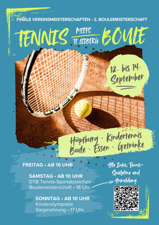 Unter dem Motto „Tennis meets Boule“ lädt der Tennisverein Leiberg vom 12. bis 14. September zum großen Familienfest ein. Neben den spannenden Finalspielen der Vereinsmeisterschaften und der 2. Leiberger Boulemeisterschaft erwartet die Besucher ein buntes Programm für die ganze Familie. Am Samstag können Interessierte Ihr Können beim DTB Tennis-Sportabzeichen testen und am Sonntag wartet eine bunte Kinder-Olympiade auf die kleinen Gäste.